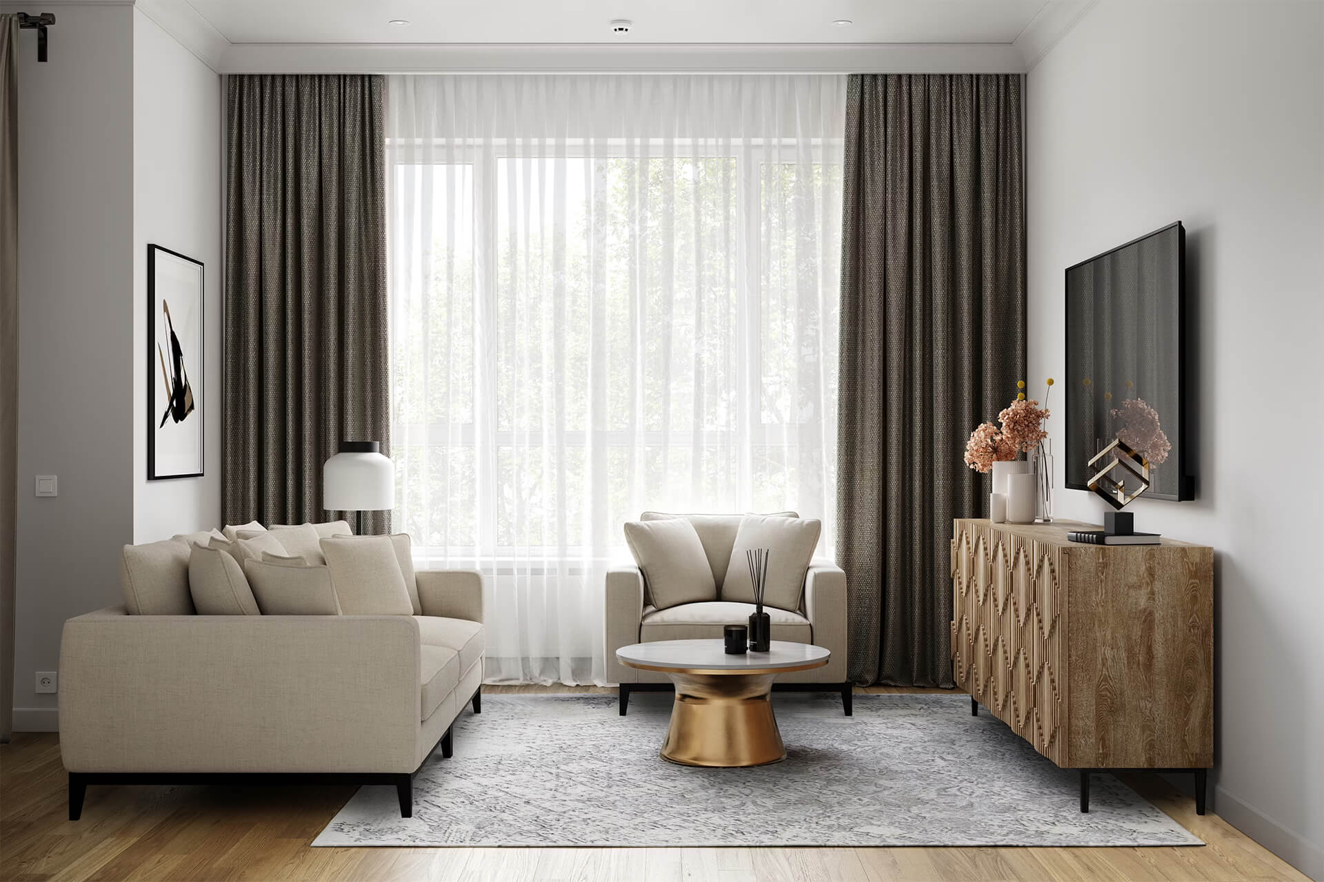 Отделка квартир выполнена в стильных современных решениях, что позволяет сразу заехать и начать комфортную жизнь без дополнительных вложений. В интерьере использованы премиальные материалы, включая натуральный камень, керамогранит, качественные обои и паркетную доску. Санузлы оборудованы импортной сантехникой ведущих брендов, системой теплого пола и встроенной подсветкой. Панорамное остекление в квартирах не только наполняет пространство естественным светом, но и подчеркивает современный стиль интерьера.