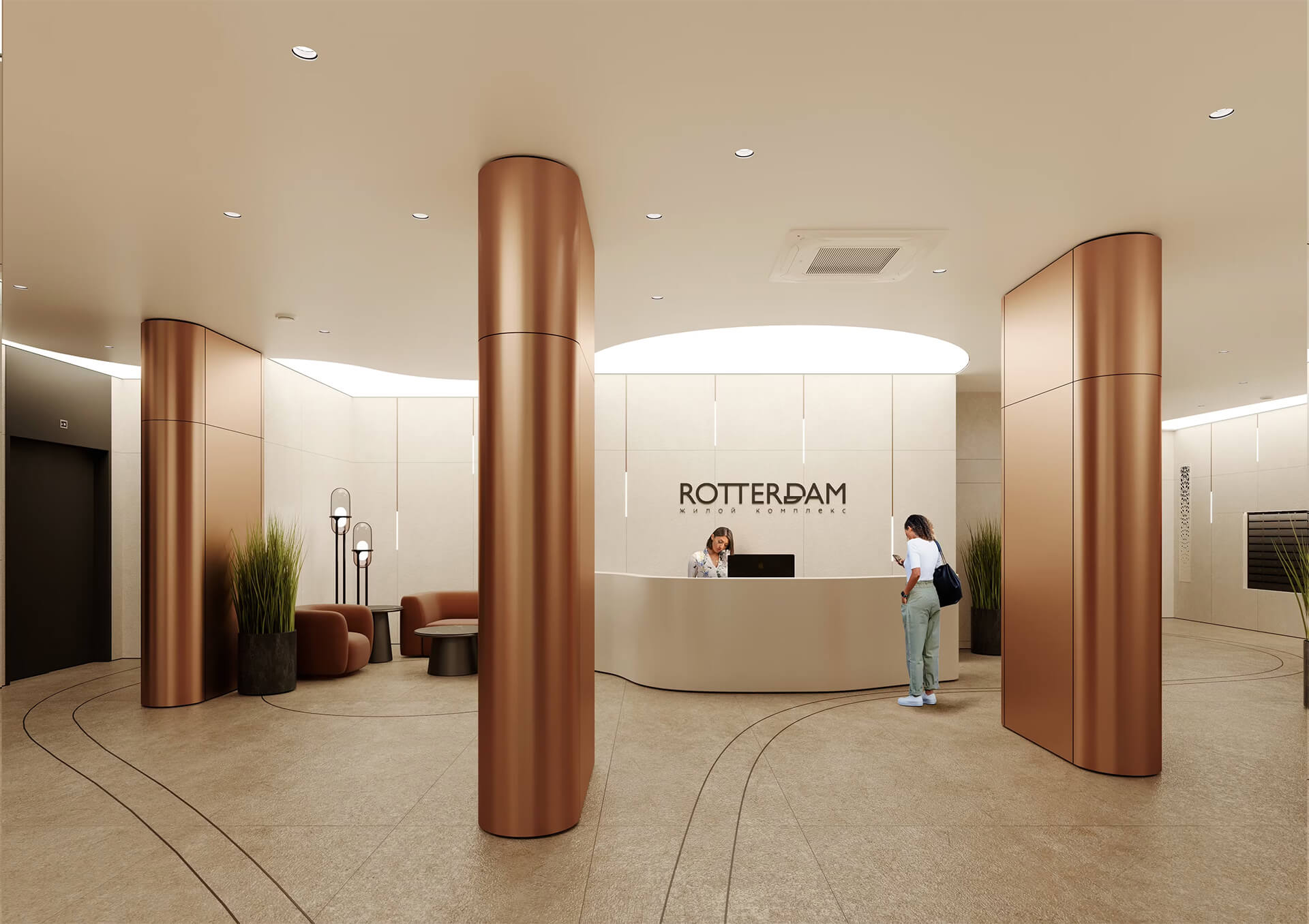 Лобби жилого комплекса «Роттердам» отражает его статус и высокий уровень комфорта. Входные группы оформлены с использованием натурального камня, дерева, дизайнерской мебели и стильных элементов освещения, создавая атмосферу уюта и респектабельности.